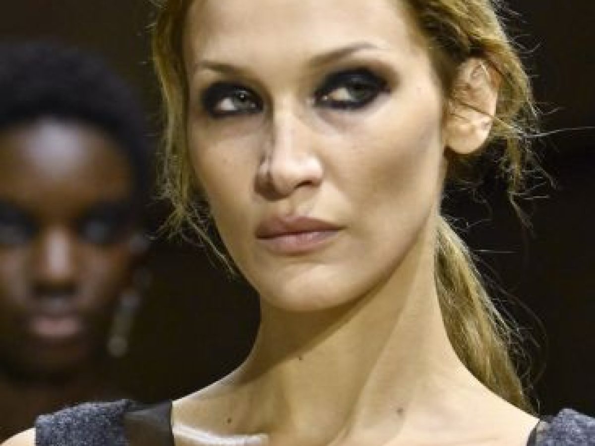 Στην πασαρέλα, η Bella Hadid εμφανίστηκε σχεδόν αγνώριστη. Με έντονα σμιλευμένα ζυγωματικά και μάτια τονισμένα με σκιά σε βαθιά ανθρακί απόχρωση και gel eyeliner που αγκάλιαζε το βλέμμα, ενσάρκωσε απόλυτα τη φιλοσοφία του «κουρασμένου κοριτσιού». Το αποτέλεσμα ήταν ωμό, gothic και συνειδητά μακριά από την ιδέα της άψογης, φωτεινής επιδερμίδας.