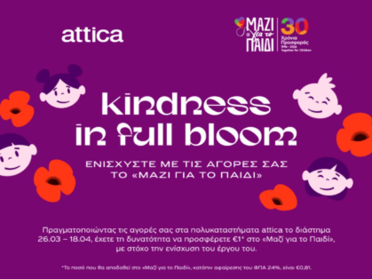 Από τις 26 Μαρτίου έως και τις 18 Απριλίου, η δράση Kindness in Full Bloom μπορεί να μετατρέψει κάθε επίσκεψη στα attica σε μια μικρή πράξη αγάπης. Με κάθε αγορά, οι πελάτες έχουν τη δυνατότητα να προσφέρουν €1 υπέρ του «Μαζί για το Παιδί», στηρίζοντας έμπρακτα τα προγράμματα που αγκαλιάζουν παιδιά και οικογένειες σε ανάγκη. Το συνολικό ποσό που θα συγκεντρωθεί θα διατεθεί εξ ολοκλήρου στον οργανισμό, ενισχύοντας το πολύπλευρο έργο του.