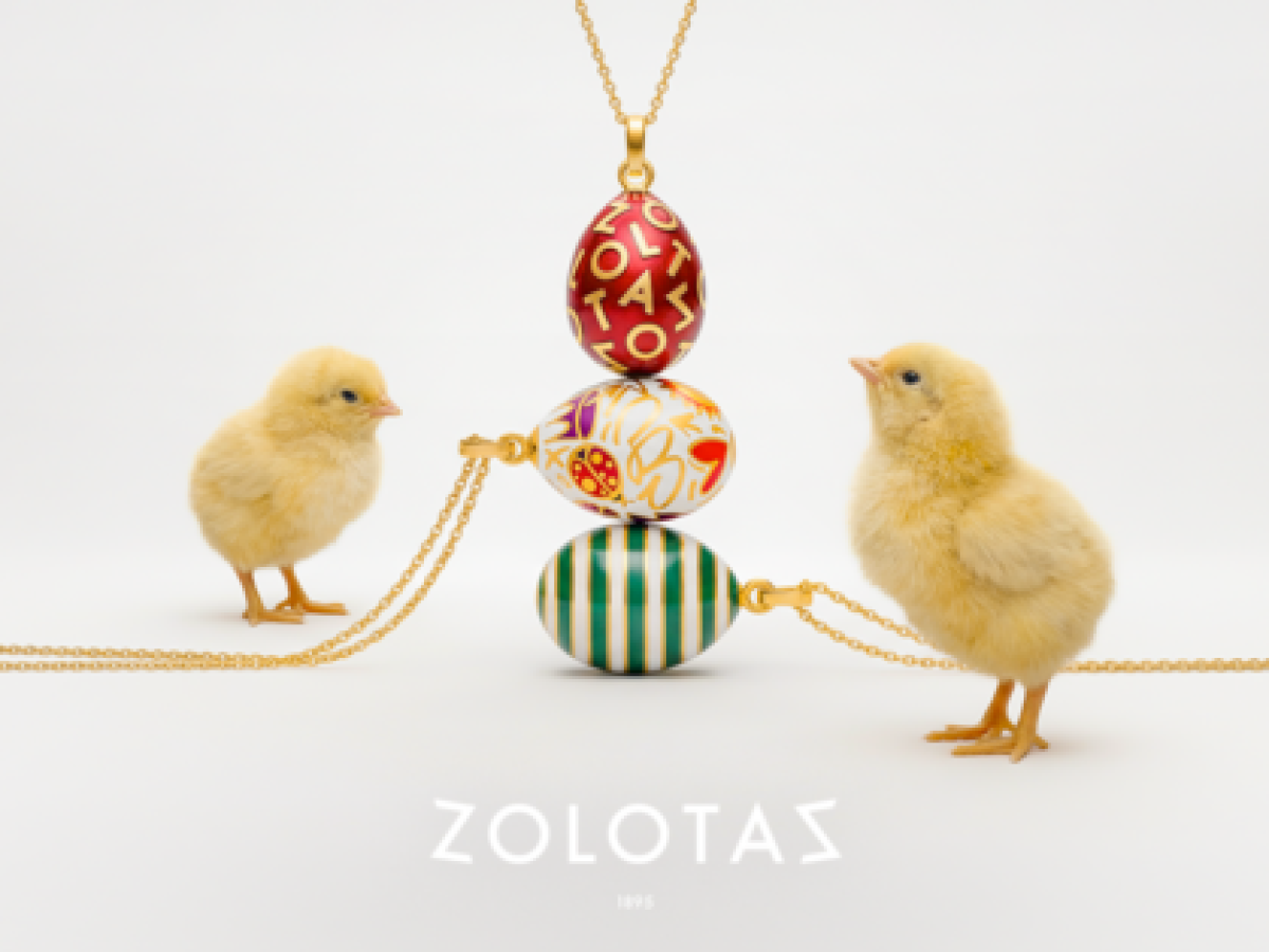 Στη συλλογή «Dancing Letters», τα γράμματα ZOLOTAS κινούνται με παιχνιδιάρικη ελευθερία πάνω στην επιφάνεια του αυγού, δημιουργώντας ένα δυναμικό μοτίβο «χορού», που αναδεικνύεται μέσα από ημιδιάφανα σμάλτα σε μεταλλικές αποχρώσεις.